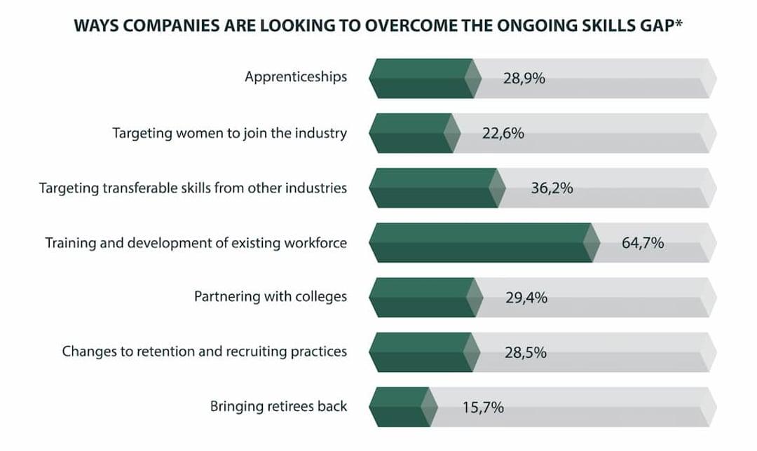 Employers are looking at a range of solutions to address the problem, such as expanding training programmes for their existing workforce (64%), broadening their recruitment processes to target people with transferable skills in other industries (36%), and collaborating with colleges to attract top graduates (29%). In addition, nearly a quarter of companies (22%) have launched initiatives to recruit more women, helping to address the industry’s gender imbalance.