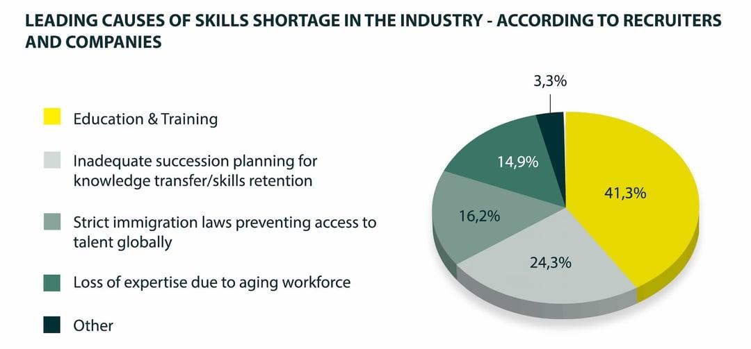 Other factors include inadequate succession planning and knowledge transfer (24%), strict immigration laws that prevent companies from sourcing talent globally (16%), and a loss of expertise due to retirements (15%). In addition, less and fewer younger candidates/specialists are entering the industry.
