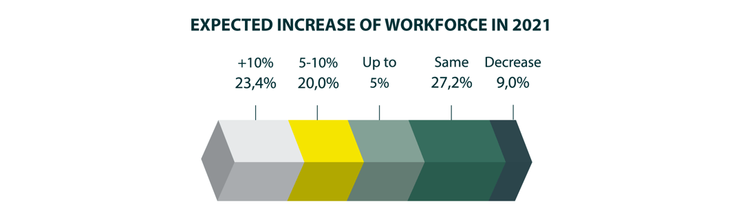 In fact, the industry is growing: nearly two-thirds of employers (65%) expect their workforce to increase in the next twelve months, which could lead to substantial industry growth overall. Indeed, nearly a quarter (23%) of respondents to our 2021 Energy Outlook Report suggest they will see the number of roles go up by more than 10%.