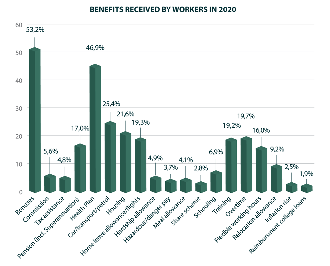 Encouragingly, three fifths of employees (61%) now say they receive benefits on top of their salaries, an uptick from 57% the previous year. Bonuses (53%) and Health Plans (47%) were the two most common benefits received - up sharply from 2019 in both cases - followed by travel assistance (25%), housing (21%), and overtime (20%).